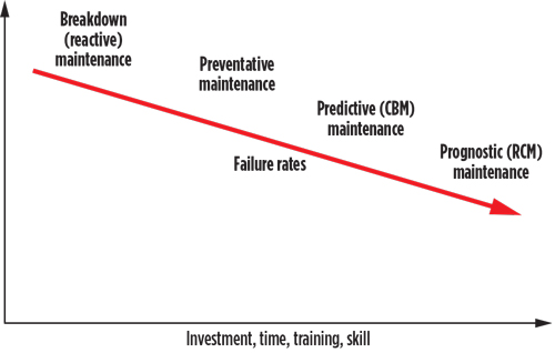 The strategy for integrity management and maintenance will vary on the complexity and criticality of a particular component. The Department of Defense’s Condition Based Maintenance Guidebook (CBM) presents four distinct maintenance strategies, recreated in Fig. 3. The strategy with the highest failure rate is breakdown maintenance (fix it when it breaks); the strategy with the lowest failure rate is reliability-centered maintenance (RCM). RCM is also referred to as prognostic maintenance. Implementing maintenance strategies to reduce failure rates incurs additional investments in time, training and skill. The implementation of increasingly complex maintenance strategies should be considered on a cost-benefit basis, to determine which strategy is most appropriate. The cost-benefit analysis should include consideration of the cost of failure of the component. Million-dollar failures warrant more complex maintenance strategies than failures having negligible impact.