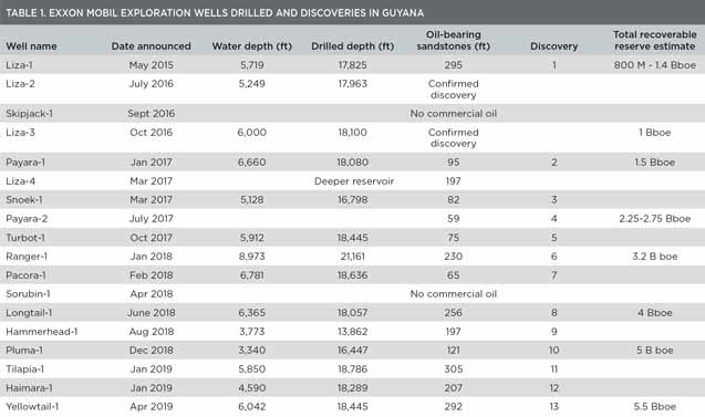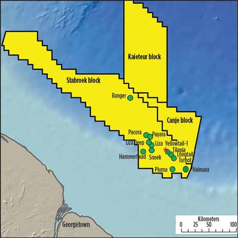 Flurry of discoveries. In 1999, before the USGS assessment, Exxon Mobil and Shell signed an agreement with the Guyanese government for offshore exploration. Shell pulled out of the arrangement in 2012, and Exxon Mobil (45%) brought in Hess (30%) and CNOOC’s Nexen (25%) as partners in the 6.6-million-acre Stabroek Block, 90 mi off the Guyana coast. In May 2015, the Liza-1 exploration well, drilling in 5,719 ft of water, encountered 295 ft of high-quality oil-bearing sandstone upon reaching 17,825 ft, TVD. Exxon Mobil estimated that the reservoir contained recoverable reserves between 800 MMboe and 1.4 Bboe. Based on these results, Exxon Mobil contracted Petroleum Geo-Services (PGS) to conduct the largest 3D seismic survey in the operator’s history, to provide a more detailed assessment of the Stabroek Block’s geology. By March 2017, Exxon Mobil had confirmed the Liza discovery with three appraisal wells, and had made new discoveries with the Payara-1 and Snoek-1 wells, confirming the promise of the USGS assessment, Fig. 1.