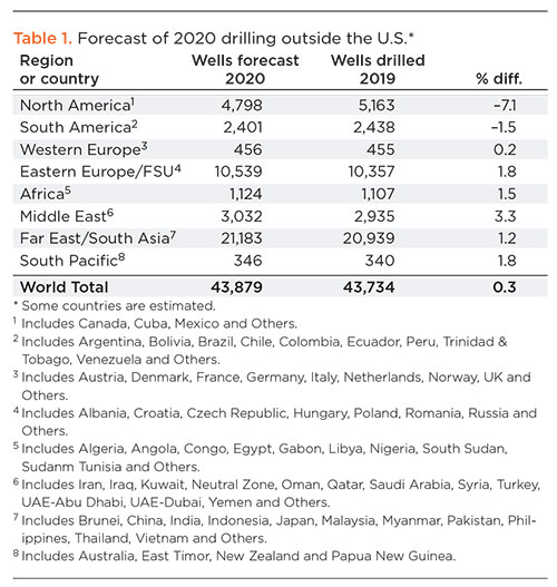 The aforementioned factors, along with World Oil’s surveys of international petroleum ministries and departments have all shaped this cycle’s forecasting process. Accordingly, World Oil’s editorial staff forecasts 2020 international E&P activity, as follows: