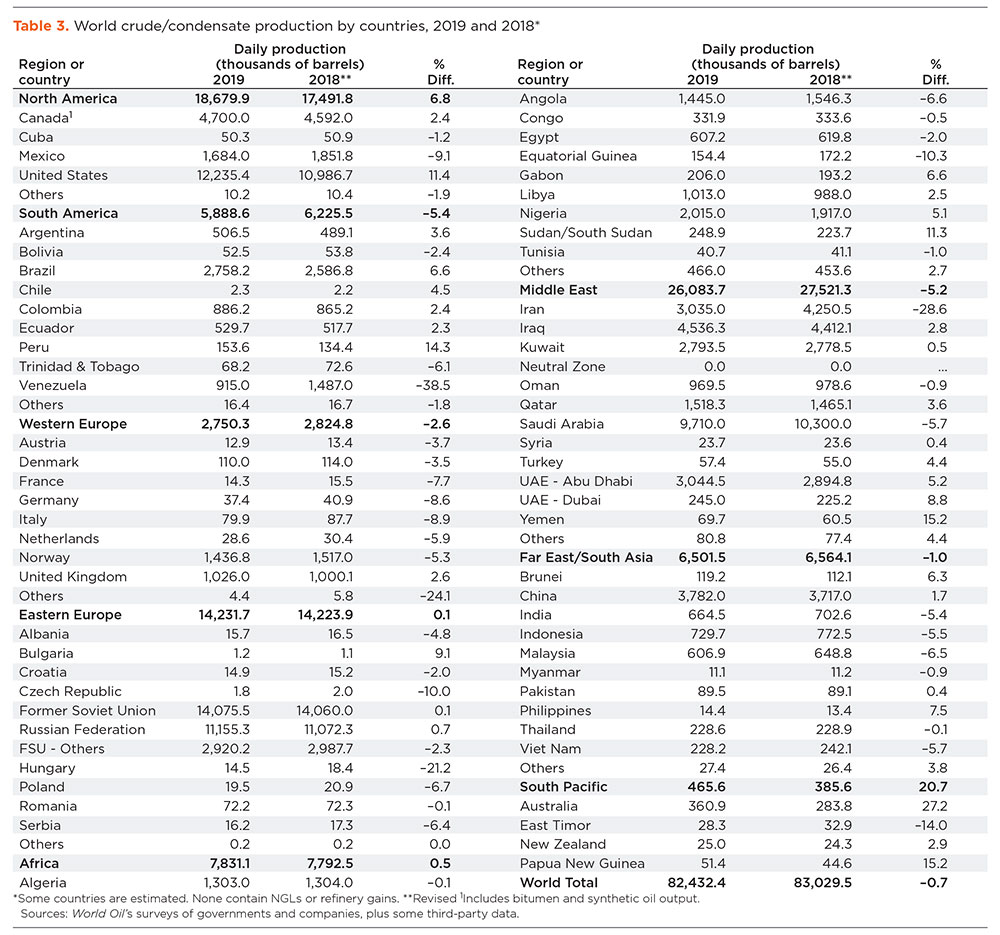 Global oil and condensate production averaged 82.432 MMbpd during 2018, down 0.7%, Table 3.