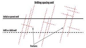 As development of unconventional reservoirs continues with tighter and tighter well spacing, some of the current production and subsequent reserves of the initial well are often compromised. In many cases, the initial well consists of large, permeable fracture networks connecting to much tighter matrix reservoir rock. By the time the infill well is drilled, the initial well in the spacing unit may have already produced several hundred thousand barrels of fluid. This depletion often creates a lower-stress environment around the induced fractures of the parent well—in other words, a pressure sink may form predominantly in the fracture network.