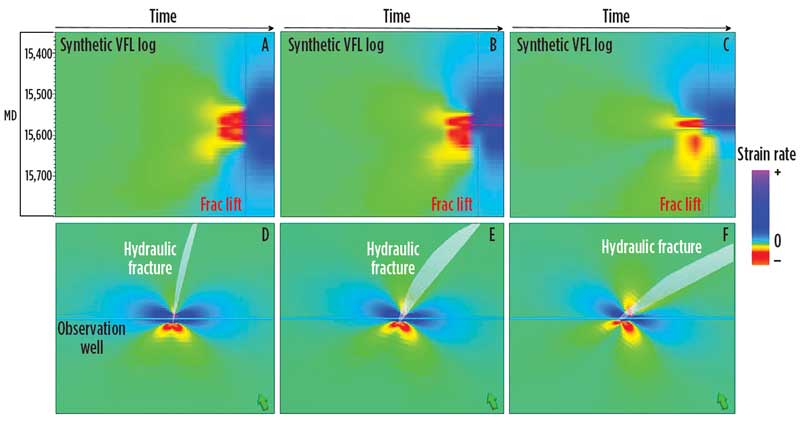 Synthetic VLF response modelling can also generate signature templates for different fracture propagation scenarios. As can be observed in Fig. 4, the expected frac hit signature changes depending on the hydraulic fracture propagation direction with respect to the wellbore trajectory. Multiple scenarios can be modelled to span uncertainties in in-situ stress directionality and/or the possible hydraulic fracture reorientation due to, for example, the presence of natural fractures and sub-seismic faults. Such templates can be useful to resolve hydraulic fracture characteristics based on the post-job interpretation of the VLF data, especially when combined with additional data sources like microseismic.