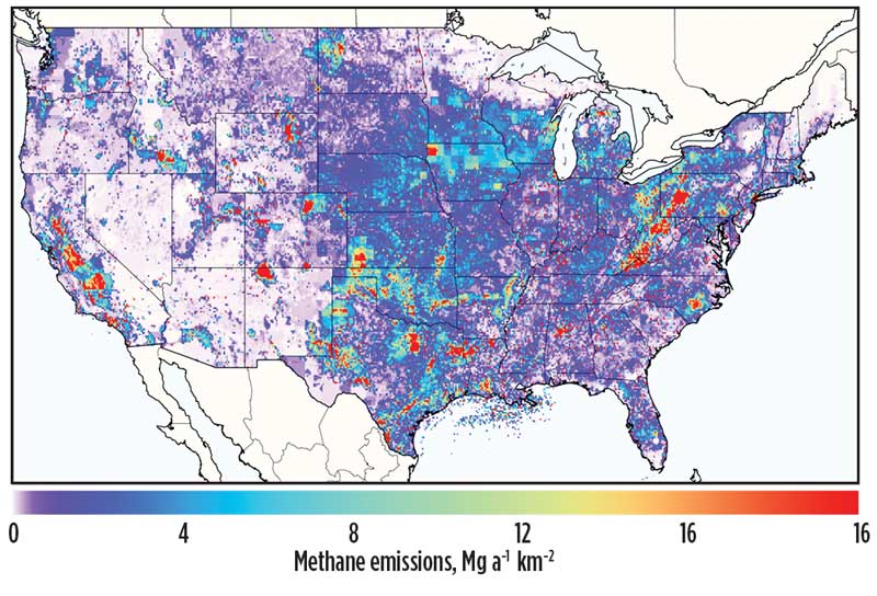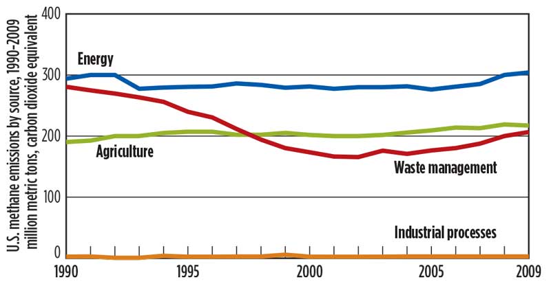 Compared to carbon dioxide (CO₂), methane (CH4) accounts for a significantly smaller percentage of all U.S. greenhouse gas emissions. Methane’s lifetime in the atmosphere is much shorter than CO₂, but CH4 is more efficient at trapping radiation in the atmosphere than CO₂. Pound for pound, the comparative impact of CH4 is greater than CO₂ as a greenhouse gas, Fig. 1.