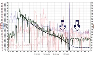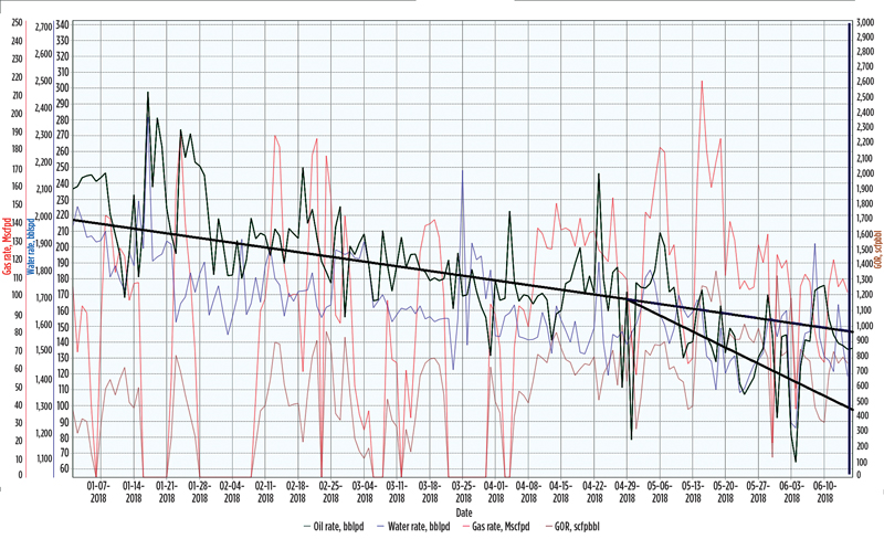 This well was monitored for abnormal production. A sustained drop in production would indicate a mechanical blockage, but operations must rule out pump problems or any other operational changes. The San Andres reservoir commonly has bacteria and scale, which is difficult to treat in horizontal wells. Experience with other wells in the area (same reservoir) show the need to clean out after approximately 18 to 30 months after initial completion.