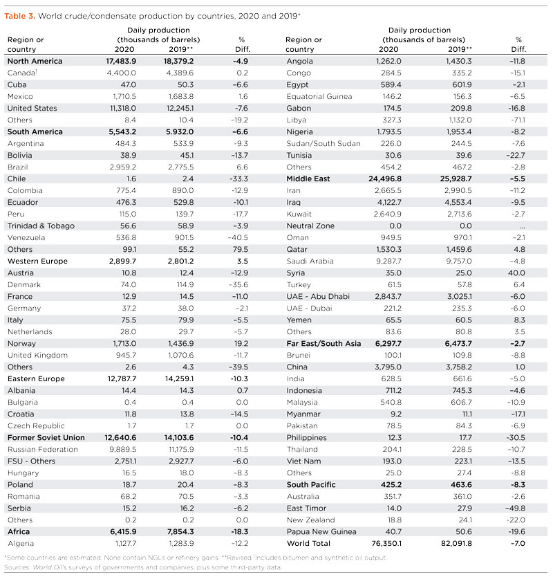 Worldwide crude and condensate production was down a very significant 7.0%, dropping from 2019’s 82.1 MMbpd to last year’s 76.4 MMbpd, Table 3. This was due to the global drop in demand caused by the Covid-19 pandemic. Ironically, the drop would have been even more severe, had it not been for Saudi Arabia and Russia engaging in a price war/production dispute during first-quarter 2020, which saw both countries dump excessive amounts of oil on the market. All regions’ output was lower, except for Western Europe, which was up marginally, gaining 98,500 bopd.