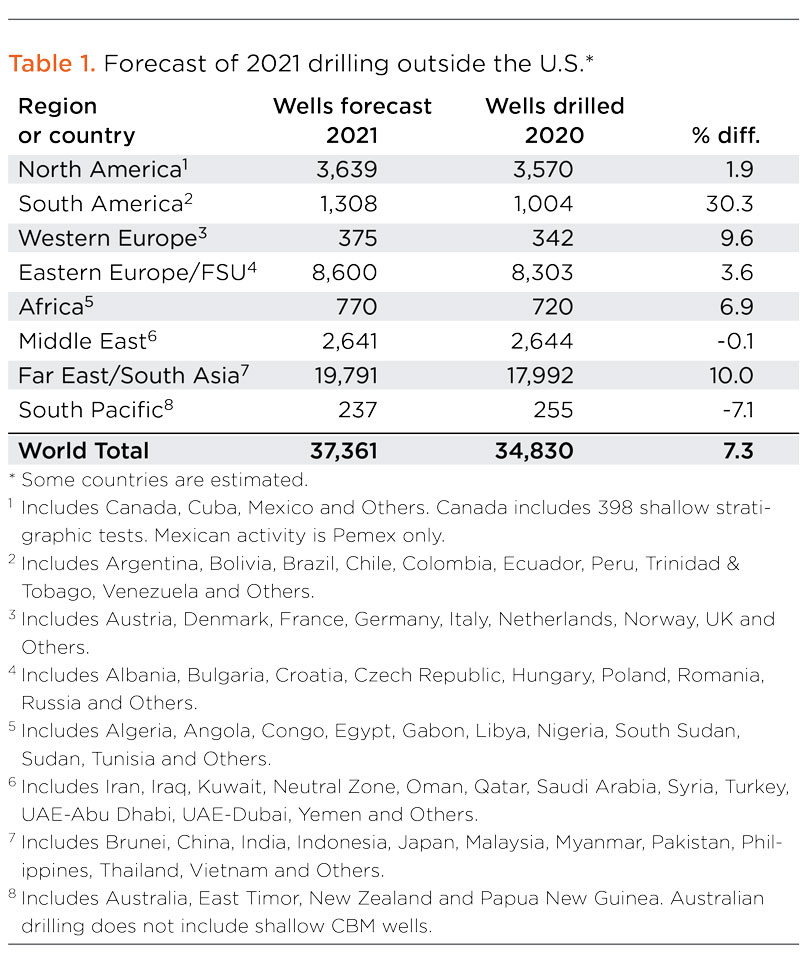 The number of wells drilled internationally during 2020 fell 12.9%, to 34,830. This year, we expect activity to rebound at a consistent pace in areas outside the U.S. and Canada. Considering the aforementioned factors, along with World Oil’s surveys of international petroleum ministries and departments, World Oil’s editorial staff forecasts 2021 international E&P activity, as follows: