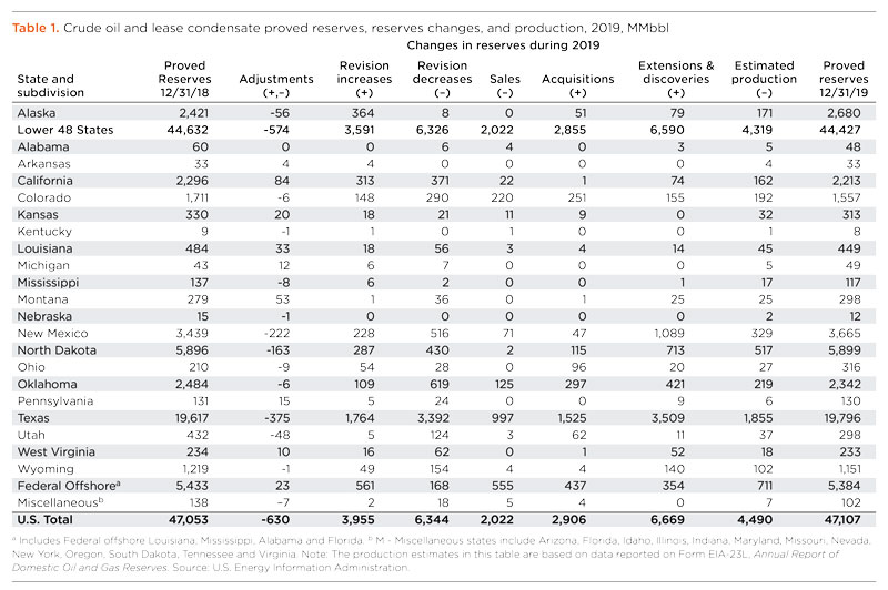 Oil. Proved reserves of crude oil increased 367 MMbbl in 2019, while proved reserves of lease condensate declined 313 MMbbl. This yielded a net gain of 54 MMbbl of proved oil and lease condensate reserves, to 47.1 Bbbl at year-end 2019. At 47.1 Bbbl, U.S. proved oil reserves in 2019 remain at the record level set in 2018. U.S. production of crude oil and lease condensate increased 12.7%, from 2018 to 2019.