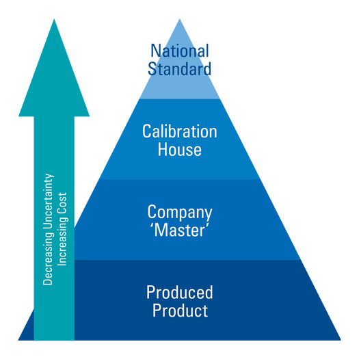 Traceability is the process of proving the performance of equipment for each stage of calibration. To provide the highest quality of measurement and, therefore, the lowest uncertainty budget, flowmeters should be traceable to primary standards, which are calibrated against National Measurement Standards. This, therefore, involves being able to trace your calibrated device to its reference or process, which, in turn, can be tracked to its calibration source, and so on, all the way to a national standard. This is often regarded as a “chain” or “pyramid” of traceability, Fig. 2. Note that the accuracy is improving as you rise through each level in the pyramid until the pinnacle is reached. Manufacturers sometimes overlook this process.