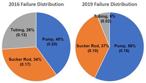 The efficacy of the software-enabled rod guide optimization strategy to extend SRP integrity and reduce material costs is exemplified in a continuing program for an established operator in the South Texas Eagle Ford play, where more than 700 horizontal wells use beam pumps for artificial lift. Typically, the pumps are landed at 5,000-12,000 ft, true vertical depth (TVD), with bottomhole temperatures of up to 300°F. There, along with deviation-related issues, they deal with corresponding challenges like paraffin deposits, corrosion, slug flow, foamy gassy fluids and high solids content.