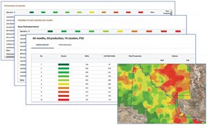 Cluster Analysis utilizes descriptive AI analytics to determine the distribution of production volumes and other key attributes across an entire basin or trend. This allows investors to quickly determine remaining production volumes and key attribute values at any location. In addition to the number of wells and production volumes remaining in each cluster, the AI analytics also allow for evaluating the production performance of individual operators, along with the engineering attributes they use, Fig. 5. This provides investors with insight into the historical performance of a potential future operator and how existing operating partners are performing within their peer group. It also ensures that these operating partners utilize best practices to optimize production.