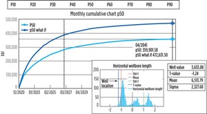 When combined with the descriptive AI analytic evaluations of attribute importance and attribute distribution, the Dynamic Analysis can help explain variations in well performance within each Investment Phase. It also can demonstrate remaining upside potential that may exist by incorporating the attribute values associated with optimized performance. As an example, Figure 4 shows the cumulative production impact of increasing the horizontal completion length of a planned well to match the calculated mean for all horizontal completion lengths in the basin.