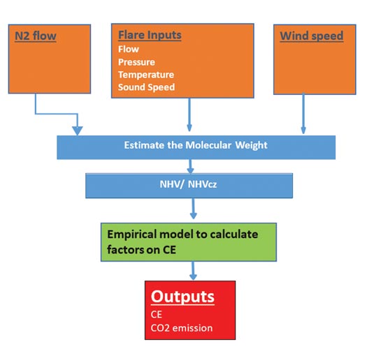 The parametric modeling method utilizing the flare process data, such as flare flow, N2 purge flow and the vent gas molecular weight, derived from ultrasonic flow meter sound speed measurement, generates the NHV of flare gas, as shown in Fig. 3. With readily available information on windspeed, gas composition, flare tip diameter, etc., an empirical parametric model calculating flare combustion efficiency based on existing test data and CFD calculations has been developed.