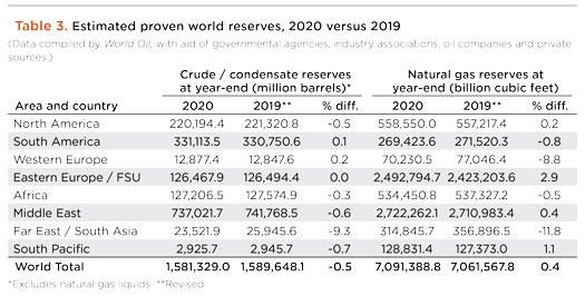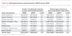 Given the reduced drilling rates worldwide, and the palpable dearth of exploration globally, it is not a surprise that oil reserve figures fell last year, Table 3. Global oil and condensate reserves fell 0.5%, to 1.581 trillion bbl. Natural gas reserves increased 0.4% to 7,091.4 trillion cubic feet.
