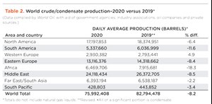 On the production front, thanks to the Covid-19 pandemic and greatly reduced demand, global oil and condensate output dropped 8.2%, to 75.992 MMbpd, Table 2. Seven out of eight regions saw declines in oil production during 2020. Ironically, the region that showed an increase was Western Europe, up nearly 5%. This region posted a gain strictly on the strength of a 258,000-bpd increase in Norwegian oil output.