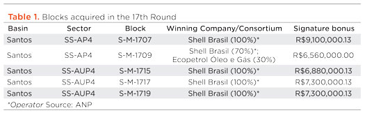The five Santos basin exploratory blocks acquired by Shell Brasil in the 17th Round are SM-1709, SM-1707, SM-1715, SM-1717 and SM-1719. Shell will be the operator of all blocks and will pay R$35.1 million in signing bonuses. In Block SM-1709, Shell will have a 70% stake, in partnership with Ecopetrol (30% stake). Shell says Brazil accounts for about 13% of thecompany’s total oil and gas production worldwide. The company has been operating there since the early 2000s. With the new blocks, it has 28 exploratory blocks, 1 field under development and 14 fields in production.