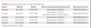Of 92 blocks offered, only five Santos basin blocks received bids from just two companies, Fig. 1. Its focus on riskier exploratory areas, in context with the pandemic, likely dampened spirits, although the government called the results positive. Shell Brasil acquired four blocks and a fifth in a 70/30 split with Colombia’s Ecopetrol. The signature bonus collected from the sale was R$37,140,000.52, Table 1.