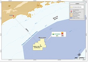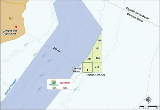 A wildcat well in block C-M-411 of the Campos basin has shown pre-salt hydrocarbons, says Petrobras. The Urissanê well is approximately 200 km from the coast, in a water depth of 2,950 m. Petrobras operates the block and holds a 50% stake in partnership with ExxonMobil Exploração Brasil Ltda. (50%), Fig. 3.
