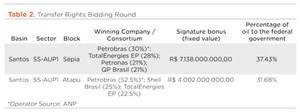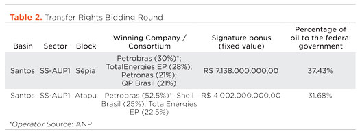 The Second Transfer of Rights Surplus Bidding Round was also conducted in 2021 and earned a positive review from ANP. The Dec. 17 sale received offers on both sale areas, Sépia and Atapu, with a signature bonus of R$ 11.14 billion, Fig. 2. As in all rounds under the production-sharing regime, the signature bonuses (amount paid in cash by companies that acquire areas in the bid) were fixed and provided for in the tender protocol. This was also a Covid-19-impacted hybrid event.