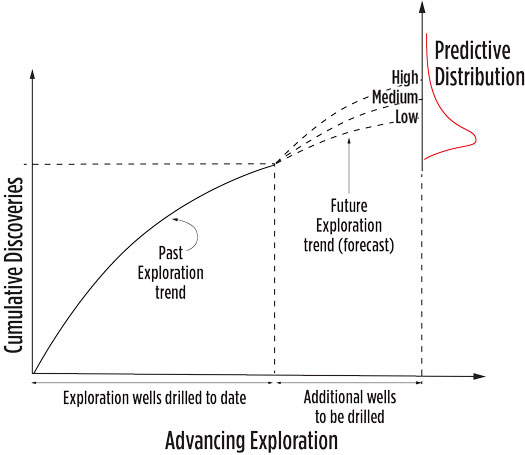In mature basins, what we’re really forecasting with our analysis is the continuation of the basin creaming curve,4 with the assumption that the curve is not about to make a significant, or step change to its trajectory by drilling a relatively small number of new wells compared to the cumulative number drilled so far, Fig. 3. By plotting the new prospects on a probability density function containing all basin discoveries to date, it helps establish “reasonableness” that the new undrilled prospect is in line with discovery sizes, Fig. 4. In practice, this calibration approach falls apart in new plays, and frontier or sparsely drilled areas, where few data are available and following introduction of breakthrough new technology like 3D seismic.