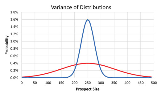 Figure 1 shows an example of prospects from two geological basins with the same P50/mean (250 MMbbl of oil) but different variances. The blue population has mean 250 MMbbl of oil and variance 625 (Standard Deviation=25), while the red population has mean 250 MMbbl of oil and variance 10,000 (Standard Deviation =100). NB: Variance is the average of the squared distances from each point to the mean, which is the mid-point (P50) for a normal distribution.