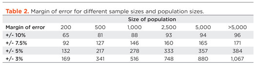 Before you can calculate a good sample size, you need some idea about the degree of precision you require, or the degree of uncertainty you are prepared to tolerate in your findings, Table 2. This table can only be used for basic surveys, to measure what proportion of a population of data have a particular characteristic (e.g. what proportion of fields use sand screens, what proportion of southern North Sea faults strike northwest to southeast etc.).