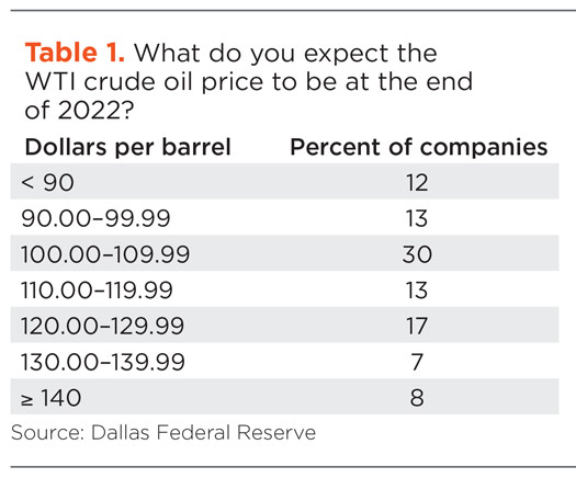 On average, respondents expect a West Texas Intermediate (WTI) oil price of $107.93/bbl by year-end 2022. This is up from a first-quarter average expectation of $93.26. Responses ranged from $65/bbl to $165/bbl, Table 1. Survey participants expect Henry Hub natural gas prices to average $7.55 per million British thermal units (MMBtu) at year-end, up a whopping 65% from the first-quarter average expectation of $4.57 per MMBtu. Responses ranged from $2.90/MMBtu to $12.00/MMBtu, Table 2. For reference, WTI spot prices averaged $119.56/bbl during the survey collection period, while Henry Hub spot prices averaged $8.38/MMBtu.