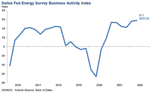Upstream oil and gas activity in the southwestern U.S. increased for the second quarter in a row during Q2 2022, according to executives responding to the Dallas Fed’s Energy Survey. The business activity index—the survey’s broadest measure of conditions facing Eleventh District energy firms—edged up to 57.7, its highest reading in the survey’s six-year history, Fig. 1. This was after jumping from 42.6 in Q4 2021 to 56.0 in Q1 2022.