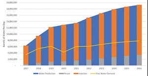 Oil and gas wells in the Permian generate millions of barrels of highly saline “produced water.” For every barrel of oil pumped from a wellhead in the Permian, anywhere from two to eight barrels of produced water are also extracted, depending on the formation and location. Today, 15.1 MMbbl of water are produced in the Permian daily, and the number is growing, Fig. 1. In the Midland, water-to-oil ratios (WOR) range from two to three barrels of water per barrel of oil. WORs in the Delaware are much higher, ranging from four to eight barrels of water per barrel of oil.