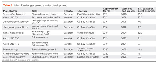 In 2018, Novatek’s discovery of North Obskoye field in Ob Bay yielded an estimate of 11.3 Tcf of natural gas reserves. In May 2020, Gazprom said its 75 Let Pobedy (75 Years of Victory) field, on the Yamal Peninsula, had an estimated 7.1 Tcf of total recoverable reserves. If both discoveries pan out, they would significantly increase Russia’s natural gas production, Table 2.