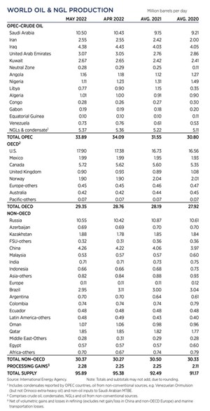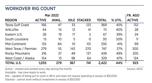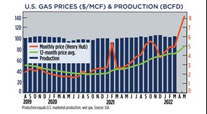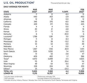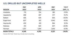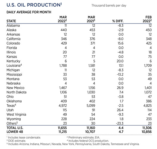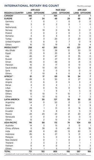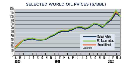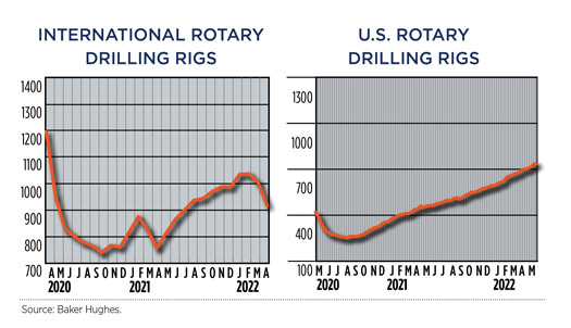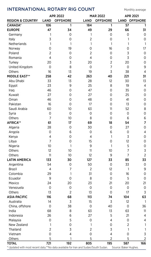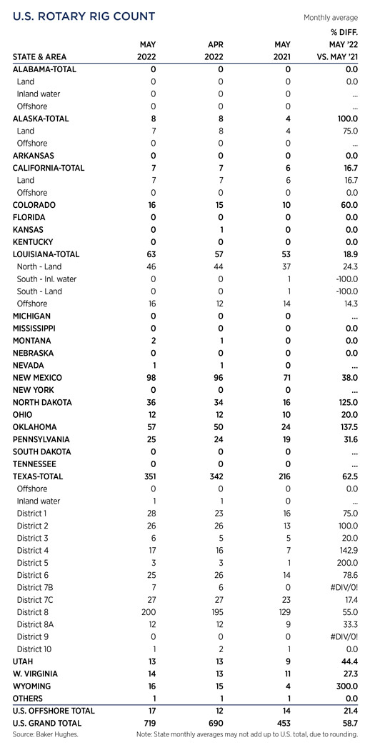 Crude prices climbed in May, as the war in Ukraine persisted. Experts predicted a drawn-out battle, which exacerbated concerns over the loss of Russian supplies, even after the war ends. WTI surged 7.4%, hitting $109.55/bbl, with Brent trading at $113.34/bbl, up 8.4% compared to April. Higher commodity prices have caused U.S. operators to slowly ramp up drilling activity, although at a slower pace than previous high price cycles. The U.S. rig count averaged 719 units in May, up 4.2% from 690 counted in April. Texas was up nine rigs to 351, and Oklahoma experienced a 14% increase to 57 units. The average rig count in May 2022 is 475 units more than the all-time low of 244 tallied during the week of Aug. 14, 2020, an increase of 195%. International activity averaged 913 rigs in April, 87 fewer than in March, due mainly to a 78-unit decline in Canada caused by spring thaw.
