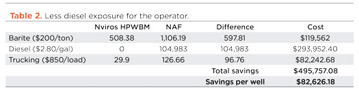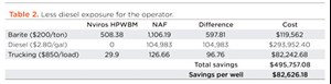 From the environmental standpoint, again, in a head-to-head against NAF, using Nviros saved 37,773 lb of CO2 per well, a total of over 225,000 lb for the six wells using HPWBM. And Nviros required no diesel, while the NAF used over 104,000 gal., resulting in a savings for the operator of almost $300,000 at the then price of $2.80 per gal. of diesel, much less than today’s price, Table 2. All these things helped reduce the average lateral cost by $1.26/ft.