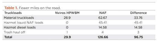 Less waste, less diesel. In addition to the chemical advantage, there is also a benefit from the human aspect. “From an ergonomic standpoint,” Dye said, “this is better for the workers on the rig, because there are no drums and there are fewer products to forklift around, so they aren’t inhaling diesel fumes or running the risk of back injuries. From a logistics aspect, there are less trucks on the road, which in the case of the Wolfcamp job, meant only 2,157 lb of waste to be hauled off to a landfill using Nviros, as compared to 21,450 lb, using the oil-based mud.”