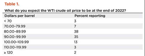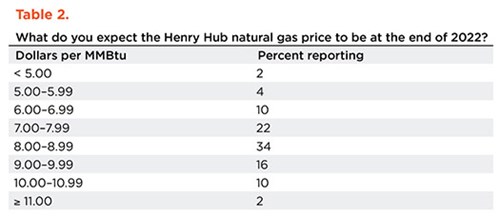 On average, respondents expect a West Texas Intermediate (WTI) oil price of $89/bbl by year-end 2022. Responses ranged from $65/bbl to $122/bbl, Table 1. Survey participants expect Henry Hub natural gas prices of $7.97 per million British thermal units (MMBtu) at year-end, Table 2. For reference, WTI spot prices averaged $85.49/bbl during the survey collection period, while Henry Hub spot prices averaged $8.16/MMBtu.