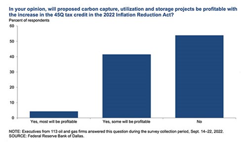 On the regulatory front, a “special question” asked of executives was “In your opinion, will proposed carbon capture, utilization and storage projects be profitable with the increase in the 45Q tax credit in the 2022 Inflation Reduction Act?” As depicted in Fig. 4, slightly over half—54%—of executives expect most proposed carbon capture, utilization and storage projects won’t be profitable, despite the increase in the 45Q tax credit in the Inflation Reduction Act. Forty-two percent expect some proposed projects to be profitable, and 4% expect more projects to be profitable.