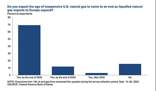 One of the “special questions” posed to survey respondents was “Do you expect the age of inexpensive U.S. natural gas to come to an end, as liquefied natural gas exports to Europe expand?” In response, most executives (69%) expect the age of inexpensive U.S. natural gas to end by year-end 2025, Fig. 6. An additional 12% of executives think it will happen by year-end 2030, and 3% expect it to occur after 2030.The remaining 16% don’t expect the age of inexpensive U.S. natural gas to end.