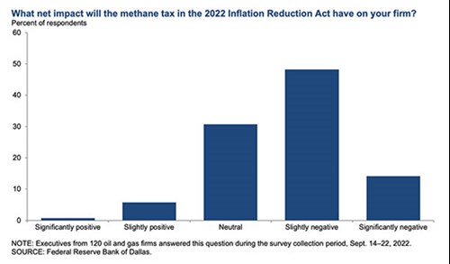Still on regulatory matters, another “special question” asked executives, “What net impact will the methane tax in the 2022 Inflation Reduction Act have on your firm?” Predictably, most executives expect a negative net impact on their firm from the methane tax in the 2022 Inflation Reduction Act, Fig. 5. Forty-eight percent of executives said they think the net impact will be slightly negative, and an additional 14% anticipate that it will be significantly negative. Thirty-one percent expect a neutral impact. Seven percent anticipate a positive impact.