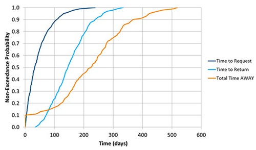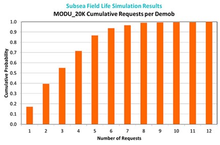 Figure 3 shows how much time the 20-Ksi DP MODU is predicted to be away, if the operator’s policy allows temporary demobilizations. For about 11% of the realizations, it never gets away from the field. If it does demobilize, there is a 50% likelihood that a service request will pop up within ~32 days. The “time to return” adds the assumed “rig remobilization response time” distribution to the statistics for time until a first service request (the light blue curve in Fig. 3). So, the result is that there is a 50% likelihood that the rig will make it back to the field within ~224 days. This means that if the MODU does demobilize from the field, there is a good chance that several service requests will have piled up before the MODU makes it back into service at the field, and production may be dropping off.