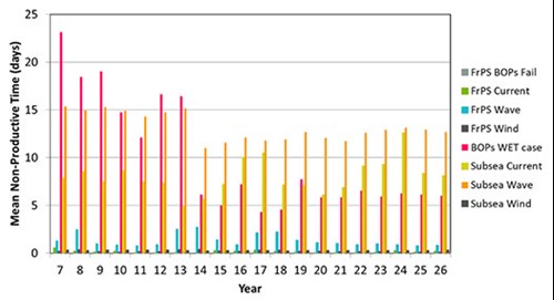 We now have a picture of how demobilizations affect the working performance of the 20-Ksi DP MODU, but what happens when it and the FrPS units are actively attempting to perform their intended operations at the field? Both the DRY tree platforms (the FrPS units) and the 20-Ksi DP MODU will experience metocean conditions and equipment failures that halt or delay operations. The following charts explore these influences and the differences between the WET case subsea well systems and DRY tree systems with direct surface access to the wells.
