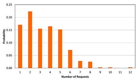 Figures 4 and 5 show us how the service request (workload) backlog builds while the MODU is away. Figure 4 indicates that while there is ~17% chance that only one service request will be waiting, there is just over a 60% likelihood of three or more service requests and an almost 30% chance that more than four jobs will be waiting when the MODU returns to the field. Figure 5 reveals a few instances where more than six jobs ended up being backlogged.