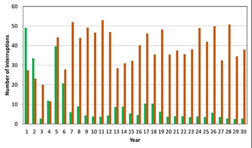 It is no surprise that there are many events that cause interruption of well servicing operations for both DRY and WET systems. Figure 6 confirms this expectation. In the early years, when the DRY scenario has a 15-Ksi DP MODU deployed to the field to perform pre-drilling at the two well centers, it is subject to a high degree of interruptions. Once a DP MODU is no longer needed, the number of interruptions drops dramatically—even though two FrPS units are working in the field. There are a couple of jumps in the number of interruptions when sensitive operations occur during the periods when the FrPS units are performing sidetracking and recompletions (years 13-14, 17-18).