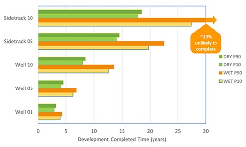Remembering that pending interventions have priority over drilling and completing a new well or starting a sidetrack/recompletion, we wrap up this section by considering how all the interventions and delays discussed above impacted full field development. Figure 14 shows the P10 and P90 range for “milestone” well completions and recompletions, with the DRY case completing all ten of its wells within ~8.5 years, while the WET case does not finish until five years later. The sidetracking results are even more disappointing for the WET case, as the tenth sidetrack has ~13% chance of being delayed outside the 30-year window.