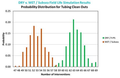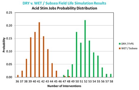 The two FrPS units will be able to perform more well interventions needed to keep wells producing as intended, which is a key reason for the recovery of an additional 31% of reserves. The following charts confirm that more tubing cleanouts and acid stimulation jobs are performed for the DRY case than for the WET (see Figs. 12 and 13). Every time a stim job or tubing clean out is performed, production from the affected well is interrupted, so it is important that such tasks are accomplished efficiently, as well as safely. Figure 11 did show that there is very little NPT associated with these operations, for either the DRY or the WET case, but it is still clear that the advantage goes to the DRY case.