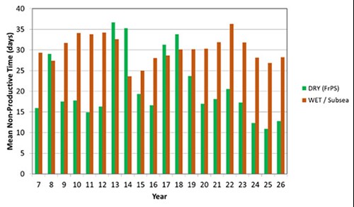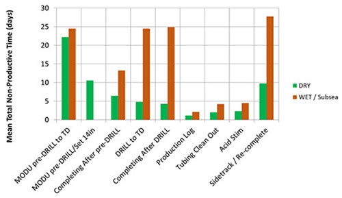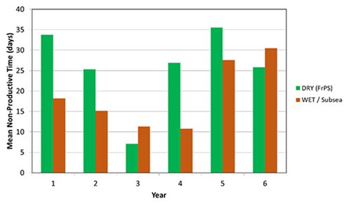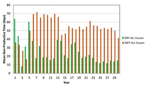 Having looked at all the causes of NPT, it is worth considering how the NPT is distributed across the various types of well operations modeled to see which operations suffer the most NPT. Figure 11 presents the results from the full life simulations (not just core producing years). This chart helps us understand why the DRY case suffers so much NPT during the early years. The NPT of the pre-drilling program for the DRY case is a combination “MODU pre-DRILL to TD” plus “MODU pre-DRILL/Set 14 in” (22.2 days + 10.5 days = 32.7days) that all occurs within the first six years of the project. The NPT of the pre-drilling program for the WET case is just 24.5 days in those years because, in that case, the 15-Ksi DP MODU only drills three wells to Target Depth (TD) at Well Center #1.