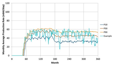 Except for the rig utilization chart discussed above, the results from simulations presented in the preceding article may appear somewhat simplified and smoothed, belying the detail of analysis behind what was reported. For example, it is worth considering how the statistics plotted in the following chart (Fig. 2) are assessed through compilation of 240 runs of the simulated 30 years of project duration. The time history of production from one “realization” (time history) for the WET case is overlaid on the statistical curves produced by data from all 240 realizations. This indicates how the monthly average production rate from “one life history” can exhibit substantial variability.