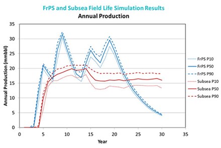 First, for convenient reference, we return to the comparison of the production profiles for the competing field development options, Fig. 1. The SLOOP software and case models were described in Part 1. The chart shows the mean, as well as the P10 and P90 percentiles of the average annual production rate. For the FrPS (Dry Tree) case, there are four distinct peaks in production rate, corresponding to completing all wells at each well center and, later, sidetrack/recompletion of the wells.