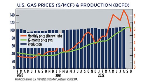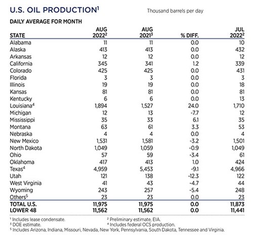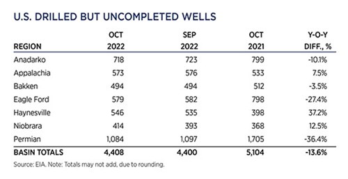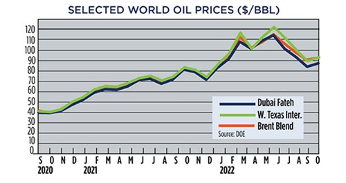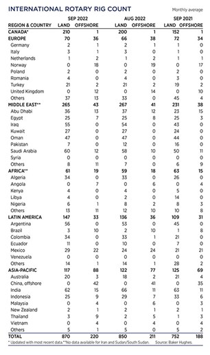 Crude prices rose in October despite concerns that demand in virus-hit China could slip, and looming European sanctions would further restrict Russian supply. WTI increased 4%, rising to $87.55/bbl, with Brent trading at $93.33/bbl, up 4% compared to September. Supply from the U.S. and Saudi Arabia remained relatively consistent, but it appears output from Russia declined 8%, down to 9.9 MMbopd in October. The price increase helped drive the U.S. rig count up to 768 units in October, six more than reported in September. Texas gained five rigs to average 366, with a three-rig increase in District 8, while West Virginia added four to 17. International activity averaged 1,090 rigs in September, 29 more than were running in August. The increase was attributed mainly to an 11-rig gain offshore Asia-Pac and an increase of 10 in Canada.