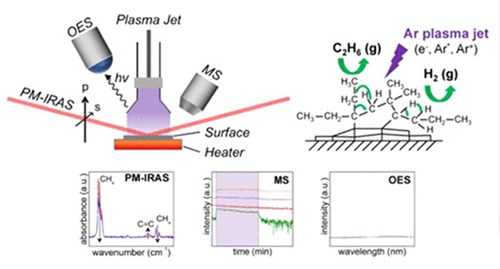 FIG. 1. A newly designed multimodal spectroscopic instrument combining polarization modulation infrared reflection-absorption spectroscopy (PM-IRAS), mass spectrometry, and optical emission spectroscopy (OES) for the investigation of plasma−surface interactions.