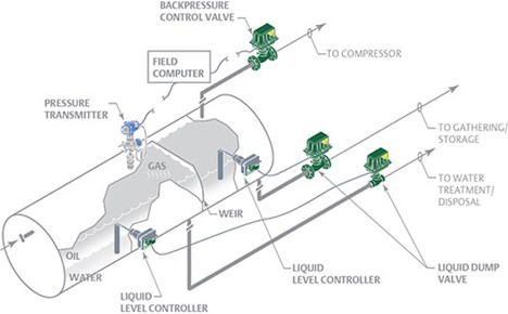 A significant opportunity for emissions reduction can be found in level control for oil separators, a simple piece of equipment used to split well fluids into gas, oil and water, Fig. 2. A typical oil separator receives a liquid/vapor mixture and utilizes gravity and weirs to separate the gas (which flows out the top), from the water (which flows out the bottom), from the oil (which overflows the weir and flows downstream for further processing).