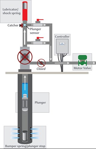 The plunger cycle starts by releasing the plunger and letting it fall to the bottom of the well. The blocked well slowly builds pressure, and when the pressure is high enough, a control valve at the surface is opened. The resulting surge of gas flow pushes the plunger to the surface, driving the liquid before it. Eventually the plunger reaches the surface, where it is trapped and held until the next purge cycle is required. Well electrification enables automatic control of the purge cycles and tight control of the resulting surge flow, which can overwhelm the gas flowmeter and understate production when poorly controlled. These advanced controls save about $85,000 a year on an average well.