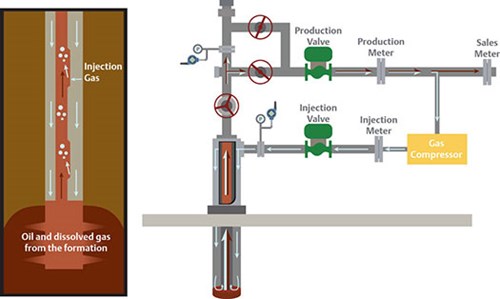 Fig. 3. Gas lift injects natural gas at the base of the well to help push fluids to the surface. Electronic controls and valves enable more advanced automation schemes to maximize production, while minimizing natural gas usage.